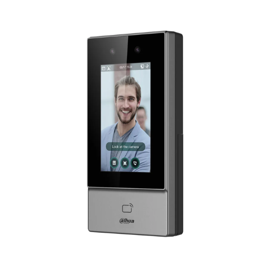 Mifare + Keyboard + Face recognition, 4.3 inča, pogodan za montažu spolja; WiFi. Terminal/WiFi i mrežni kontroler za kontrolu pristupa sa Full HD DWDR kamerom za prepoznavanje lica, mifare čitačem, senzorom za otisak prsta i virtuelnom tastaturom. 4.3″ kapacitivni ekran osetljiv na dodir (rezolucija 480×272). 2MP CMOS dual-lens kamera, DWDR, sa IC svetlom. Preciznost prepoznavanja 99.9%. Brzina prepoznavanja 0.2s. Visina/Udaljenost detekcije lica 1.1-2.0m/0.3-1.5m. Udaljenost očitavanja kartice 0 cm–3 cm. Podržava do 6.000 korisnika, 10.000 kartica, 6.000 šablona lica i 6.000 šifri. Memorija 300.000 događaja. Do 128 vremenskih rasporeda. Podrška za detekciju maske na licu i sigurnosnog šlema. Podrška za QR kod posetioca i funkcija pozivne table (video poziv). Glasovna obaveštenja. Funkcije kontrole pristupa: Anti-passback, multi-user autentifikacija. Intrusion alarm, Duress alarm, Tamper alarm. Bazer. 1x USB 2.0, 1x RS485. 1x Wiegand. 3x ulaza (stanje vrata x1, REX x1, alarm IN x1). 1x Alarm OUT. 1x detekcija statusa vrata. 1 rele (brava x1). RJ45 (10/100M), WiFi IEEE802.11b/802.11g/802.11n 2.4GHz. Protokoli: UDP, TCP, IPv4, RTSP, SIP, P2P, RTP. Interoperabilnost: CGI, ONVIF. OSDP protokol. SDK i API. Napajanje PoE ili 12V/1.5A, potrošnja ≤12 W. Kućište od plastike ojačano staklenim vlaknima. Dimenzije 180.1 mm × 90.1 mm × 27.0 mm. Masa 0.70kg. Radna temperatura -30°C-+60°C. IP65 stepen zaštite. U pakovanju sa napojnim adapterom i zidnim nosačem.