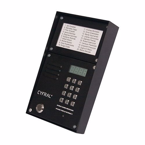 Pozivna tabla ‘eura’ ‘CYFRAL’ Z-2000PN BLACK za 255 apartmana u kompletu sa modulima PC-2000D (panel frame), LM-1000 (panel za listu stanara) i čitačem RFID kartica. DVE ŽICE KONEKCIJA. Spoljni digitalni panel PC-200D u crnoj boji. Robusan-vandal otporan i otporan na vodu sa pozadinskim osvetljenjem tastera. Izrađen od pocinkovanog čelika-plastificiran sa metalnim tasterima, zatvoren i osiguran sa dva nitna, i dva zavrtnja. Ugrađen čitač kartica preko PINA (4-cifre) ili RFID kartice. Mogućnost do 8 ključeva po jednom korisniku. LM-1000 tabla za listu stanara podržava do 40 porodica, mogućnost proširenja. Mogućnost stvaranja multi-ulazne konfiguracije za zgrade sa više ulaza, do 4 panela u konfiguraciji Master + 3x slave. Korisnik se poziva samo unošenjem broja stana, npr. Stan br.10, korisnik samo pritiska tastere 1 i 0, poziv se ostvaruje nakon 1 sekunde. U cenu seta uključena pozivna tabla, okvir za montažu u istoj boji, tabla za spisak stanara i modul digitalne elektronike CC-2000. Namenjen je za montažu na i u zid, dolazi sa zaštitnim krovom. Panel i elektroniku pokreće jedan AC adapter 12,5 v / 1.2 A (nije u kompletu).